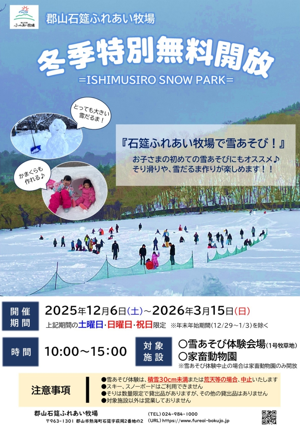 郡山石筵ふれあい牧場は、12月1日より冬季閉場となりますが、土日祝日に限り、『雪あそび体験』として牧草地の一部と、家畜動物園の無料開放を実施いたします。(※この他の施設はご利用できません。)