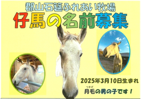 かわいい仔馬の名付け親になってみませんか? 当牧場の新しい仲間になった仔馬の名前を大募集いたします!! 採用された名前に応募され...