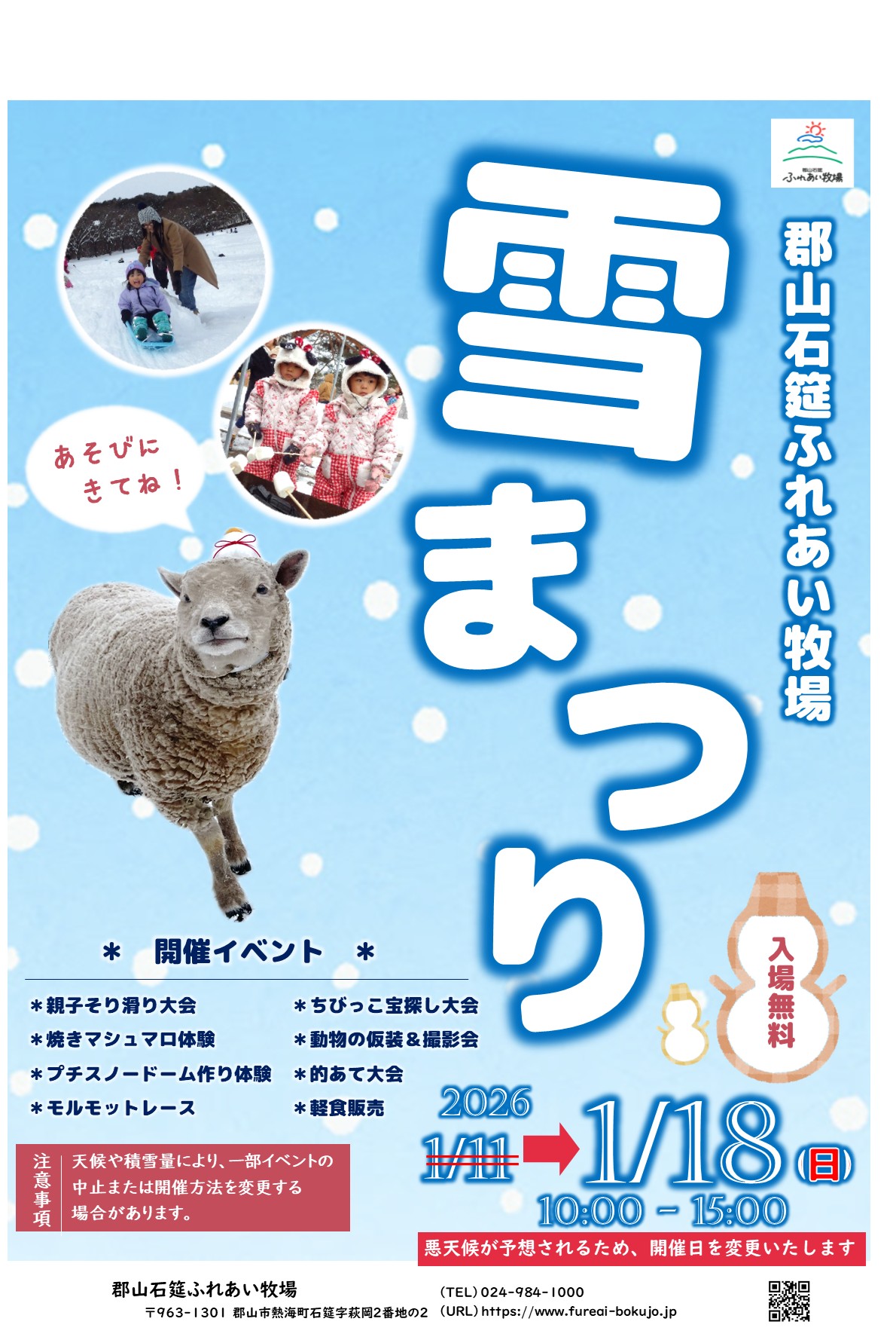 ◆郡山石筵ふれあい牧場は、12月1日より冬季閉場となりますが、土日祝日に限り、『雪あそび体験』として牧草地の一部と、家畜動物園の無料開放を実施いたします。(※この他の施設はご利用できません。)