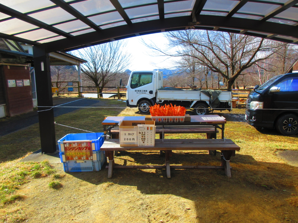 ※本日はふれあいセンター建物が修繕作業の為、カーポート軒下にて人参を販売しております。