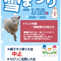 - 2026/01/17 【(1/18開催)雪まつり】一部イベントの変更について ⛄積雪量不足のため、一部イベントを変更いたします⛄ ❄️親子そり滑り大会/開催中止 ❄️ちびっこ宝探し大会/開催方法変更(牧草の...